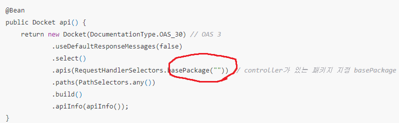 .apis(RequestHandlerSelectors.basePackage("com.~~~.~~~.controller")) // controller가 있는 패키지 지정 basePackage