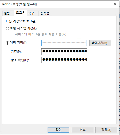 카테고리 없음 로컬 컴퓨터에서 jenkins 서비스를 시작하지 못했습니다 리놉 2022. 6. 16. 해당 컴퓨터의 비밀번호를 변경했다면, 서비스 - Jenkins - 더블클릭(속성) - 로그온 에 들어가면 아래 사진과 같은 화면이 나온다 비밀번호를 제대로 작성해주면 된다. 공유하기 게시글 관리 리놉's 개발일기 저작자표시 변경금지 (새창열림)